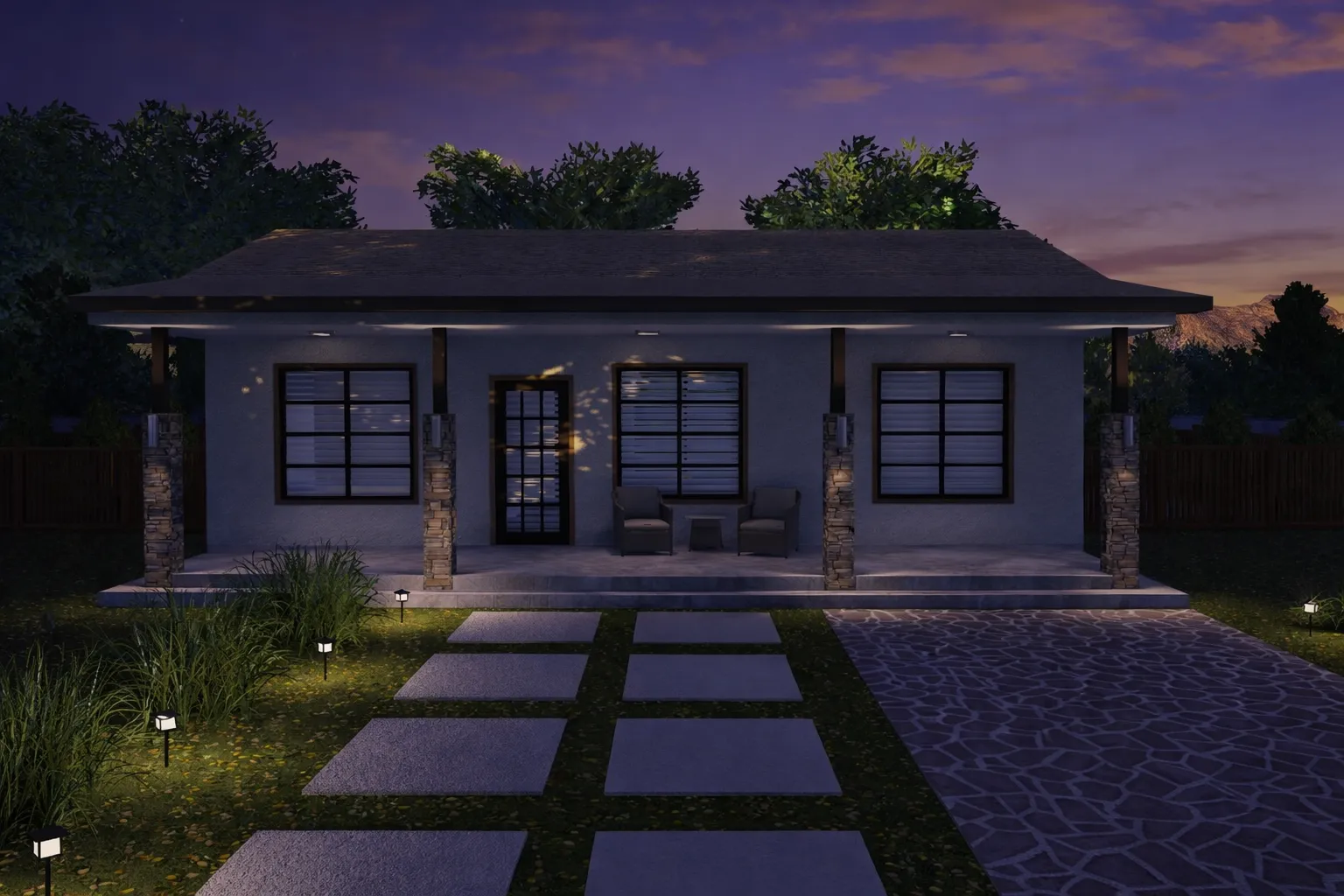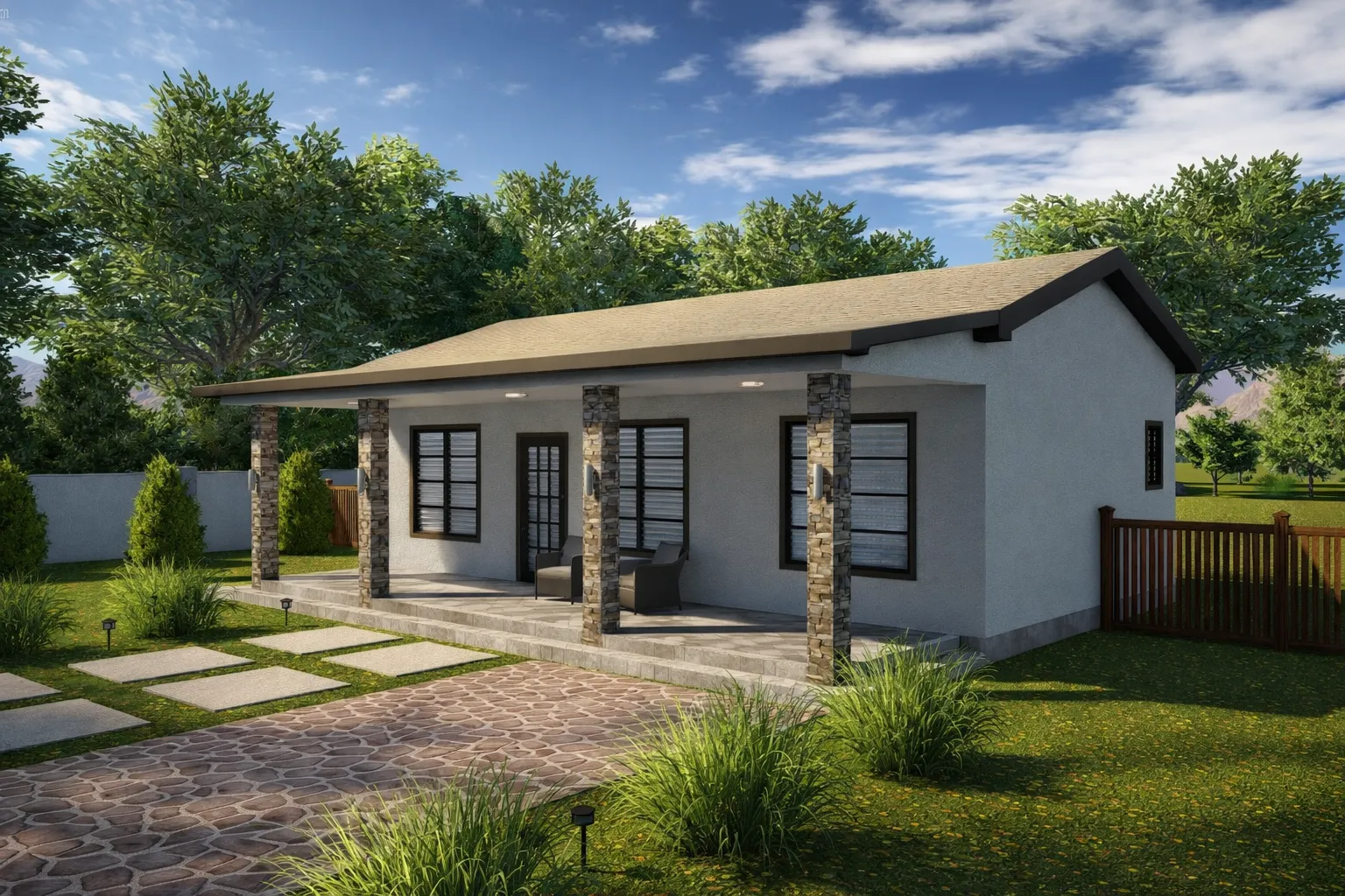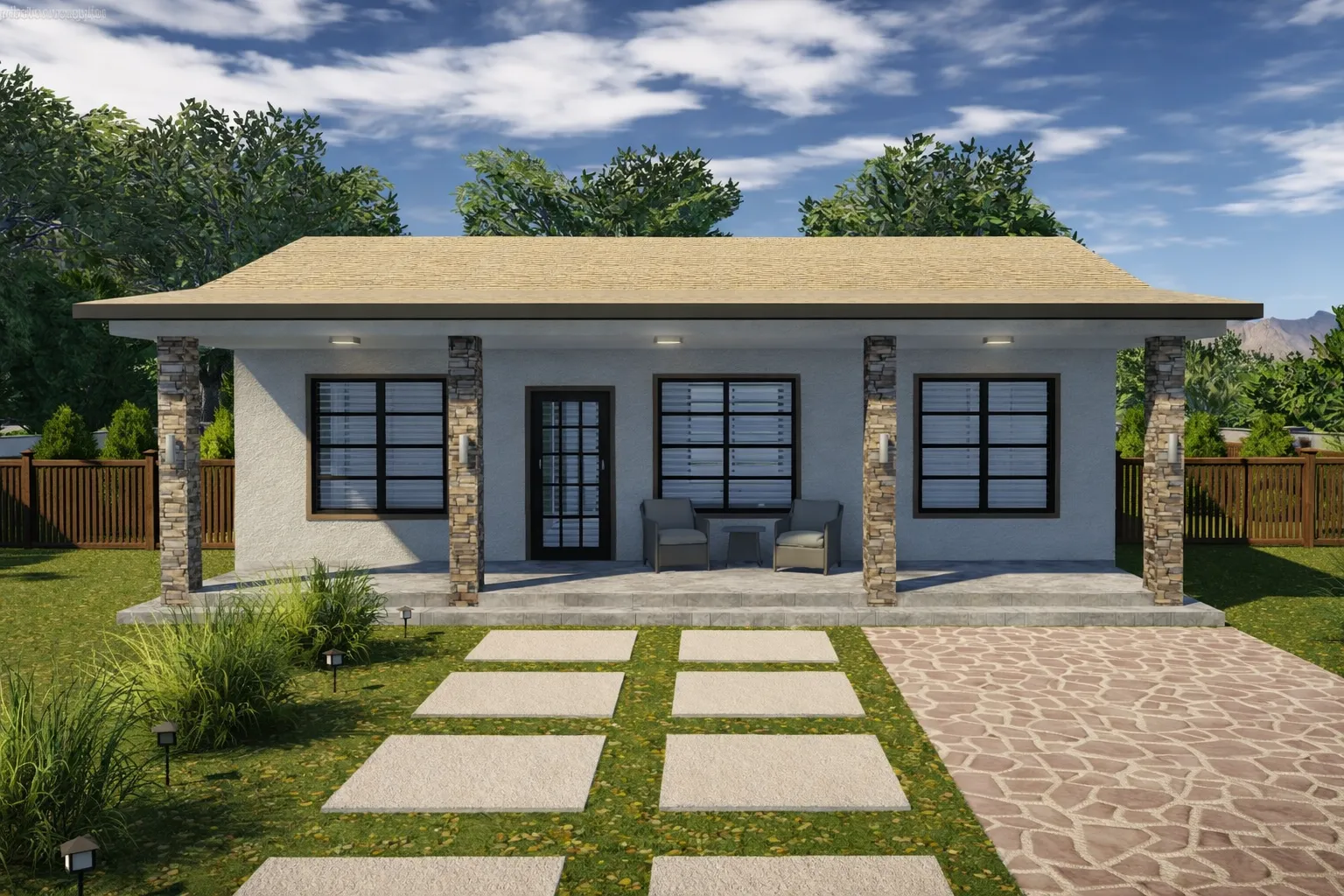 A compact and efficiently designed single-story house plan, ideal for modern living on smaller lots. This home features 2 bedrooms and 2 bathrooms arranged around a functional open living layout that maximizes usable interior space.