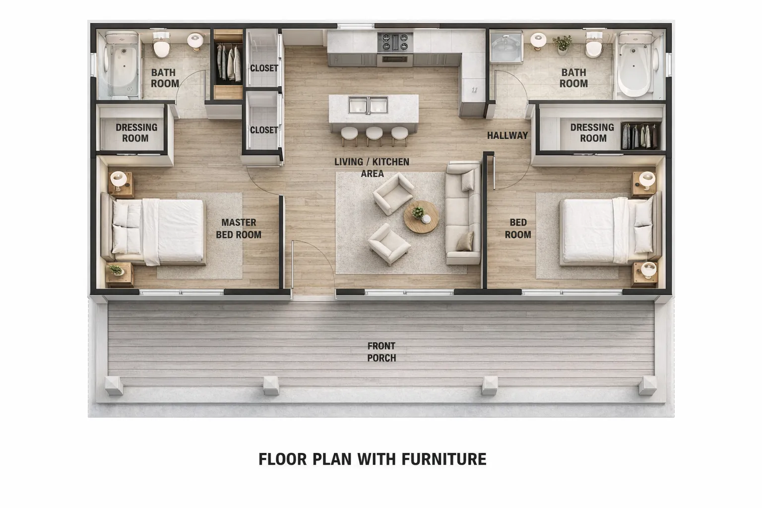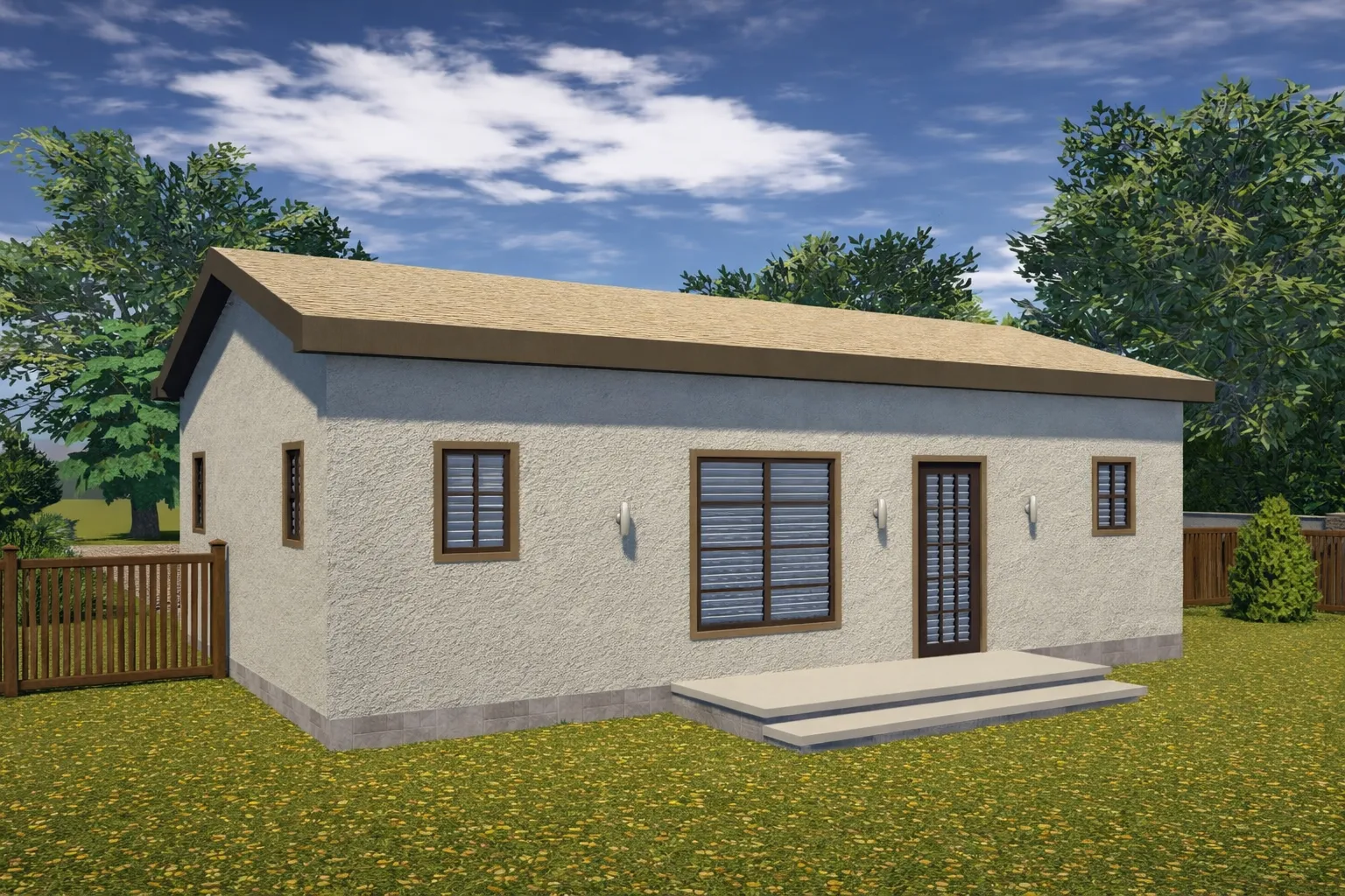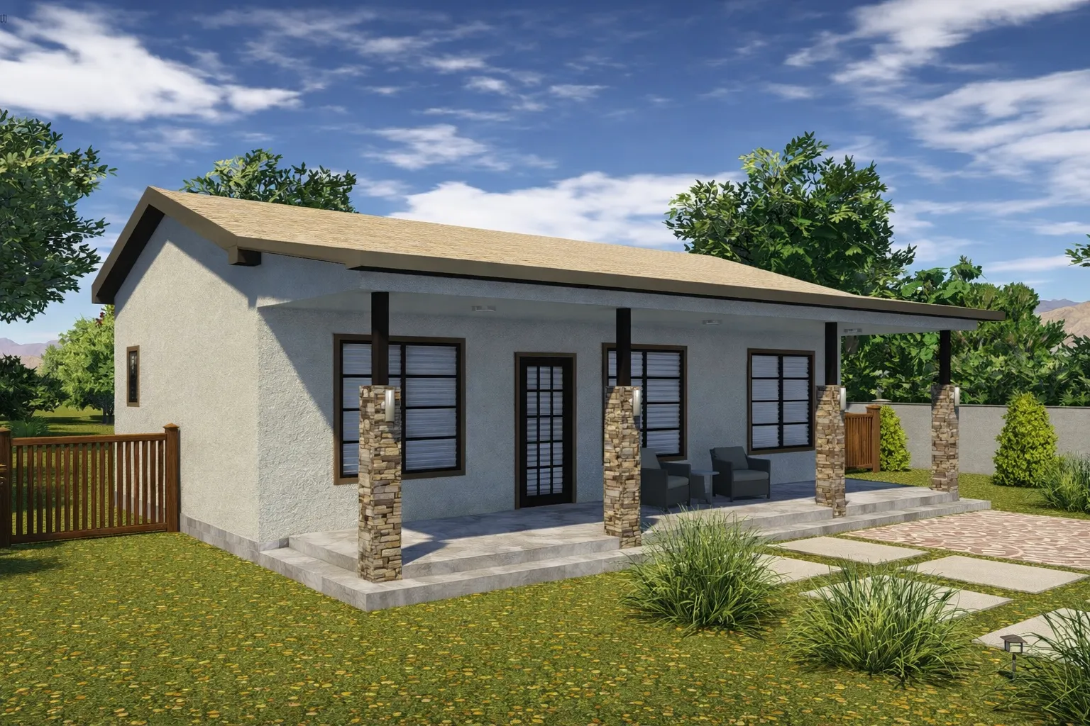 A compact and efficiently designed single-story house plan, ideal for modern living on smaller lots. This home features 2 bedrooms and 2 bathrooms arranged around a functional open living layout that maximizes usable interior space.